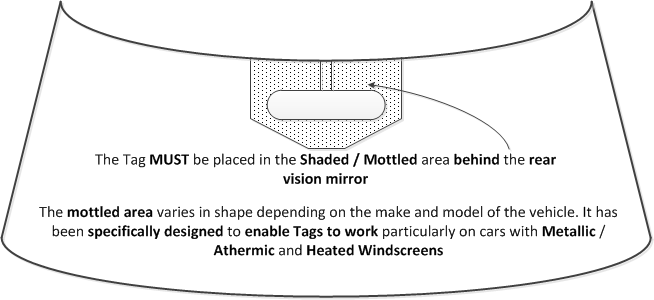 The tag must be visible from above in the centre-top of the windscreen so that it can be detected by the transponder by the barrier at the toll plaza. Please read these instructions prior to fixing the tag. The tag MUST be placed behind the rear view mirror on the shaded / mottled area.
