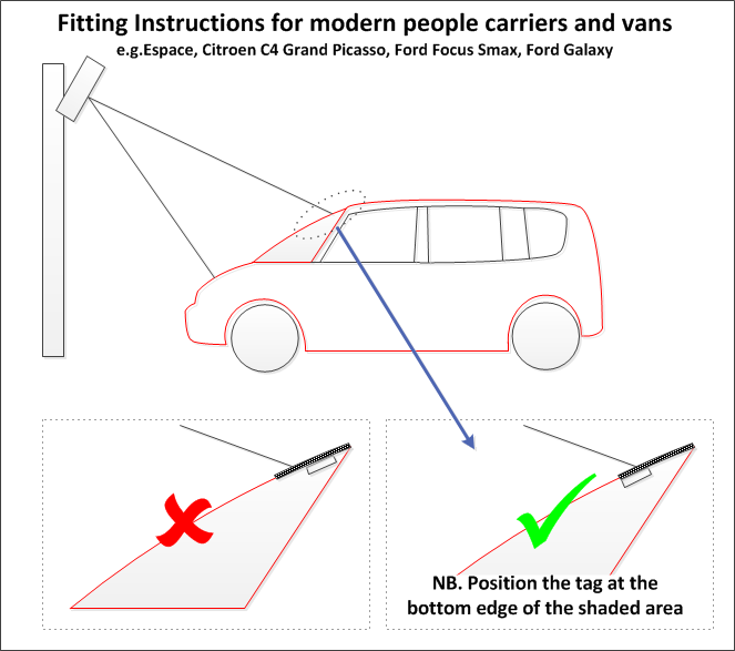 If you have a People Carrier / MPV or Van with a long windscreen please note: The tag needs to face forward towards the barrier, not upwards towards the sky.